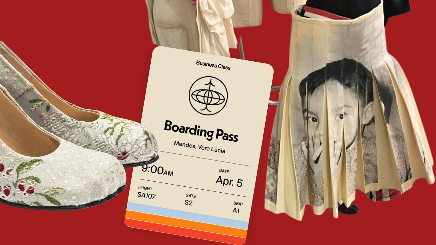Feature Image - Collage made by the author. (from left to right). Vivienne Westwood Gold Label. Shoes. Spring/Summer 2000. Summertime Collection. Brocaded silk, leather. MUDE, Francisco Capelo Collection. Author's boarding pass for Business Class. Photograph of Maria Cruz's collection process.